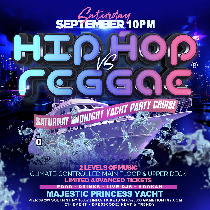 For more ticket information/ birthday packages/ to reserve a table for NYC HIP HOP VS REGGAE® SATURDAY MIDNIGHT MAJESTIC YACHT PARTY PIER 36 2025 call/ or text 3475920300 or Gametightny.com