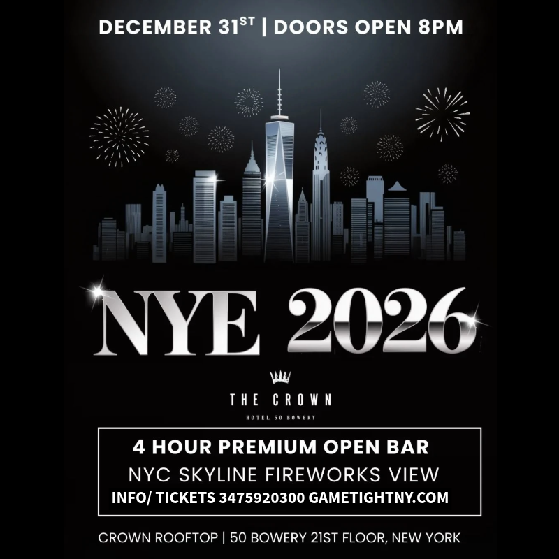 For more information/ tickets/ birthdays at New Year’s Eve 2026 at The Crown Rooftop NYC call/ text 3475920300 or log onto Gametightny.com